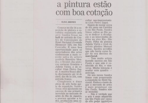 Matéria sobre exposição organizada por Sandra Simas, Centro de Convenções do Hotel Nacional, março de 1990.