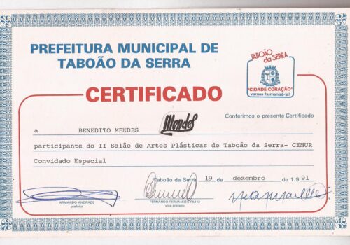 Certificado de Benedito Mendes, Mendel, no II Salão de Artes Plásticas de Taboão da Serra – CEMUR (documento original), dezembro de 1991.