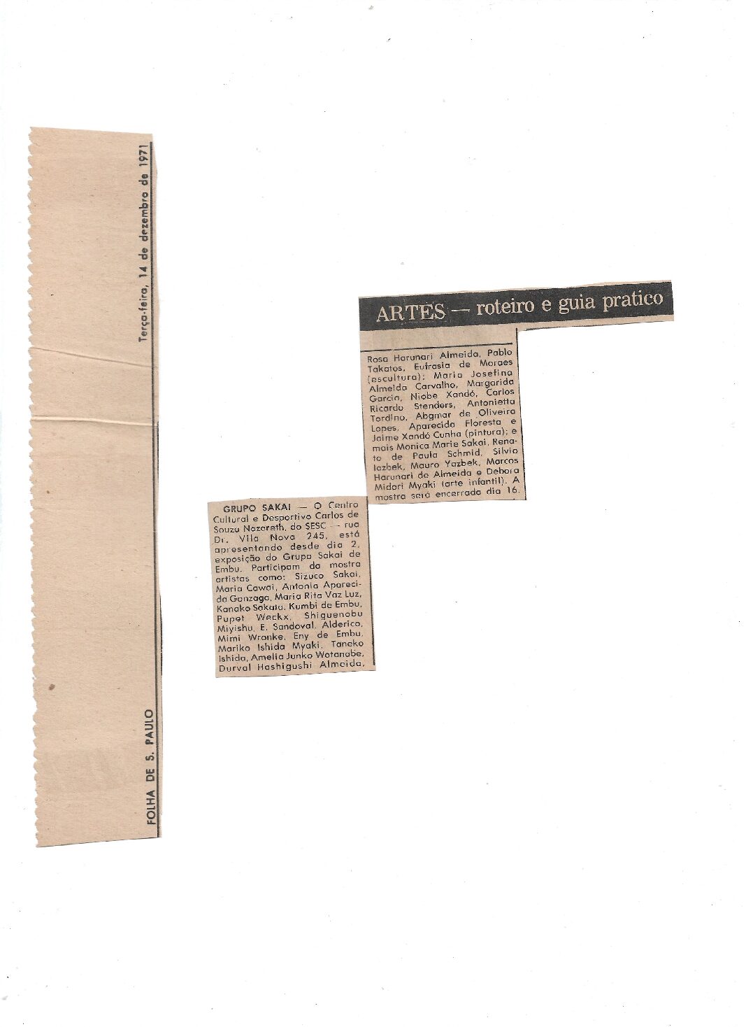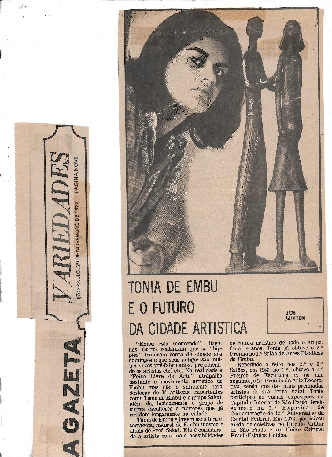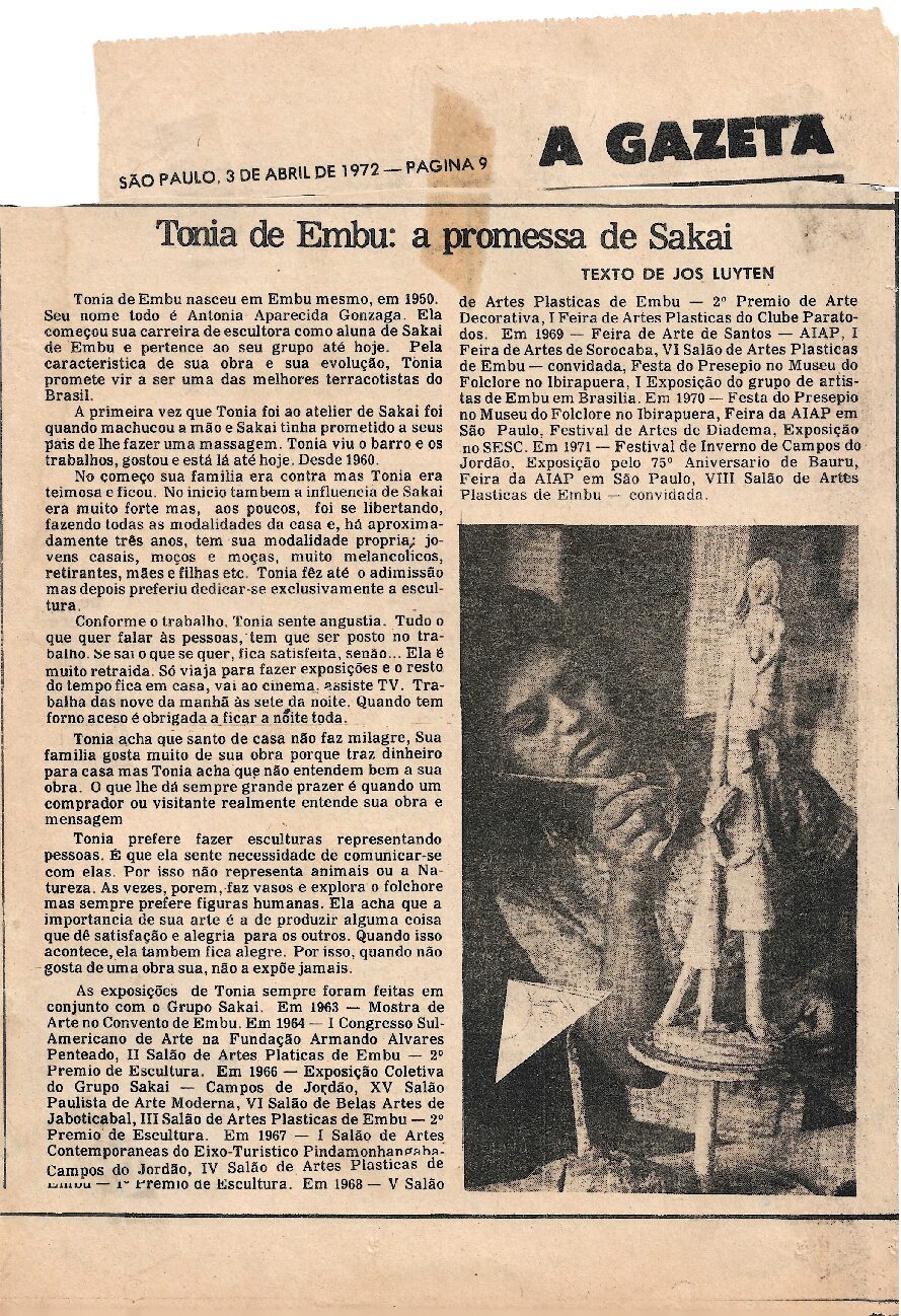 Os documentos contidos nesta pasta seguem uma linha cronológica temporal, em sua maioria reportagens de jornais em nível nacional e regional, abrangendo os passos de Tônia do Embu e consequentemente as artes. A presença forte do grupo Sakai em outras cidades, destaque aos Salões de Artes Plásticas, contendo também materiais de divulgação e promoção da Festa de Santa Cruz, assim como outras atividades artísticas dentro e fora de Embu. Conta-se também sobre as premiações e o futuro promissor da jovem Tônia e os feitos adultos. Periodicidade dos anos 60 aos anos de 2010.