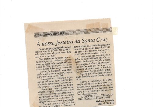 Fato Expresso, 7 de julho de 1997, reportagem “À nossa festeira de Santa Cruz”. Sobre Festa de Santa Cruz e Tonia do Embu.