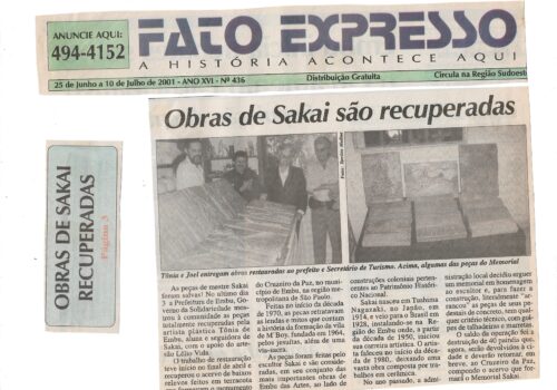Fato Expresso, junho a julho de 2001, reportagem “Obras de Sakai são recuperadas”. Sobre a recuperação por Tônia do Embu e Joel Câmara.