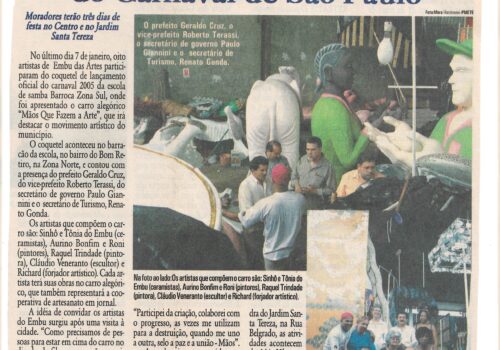 Retrato, fevereiro de 2005, reportagem “Artistas de Embu participam do Carnaval de São Paulo”.  com imagens de Tônia do Embu, governo e artistas: Sinhô, Aurino...