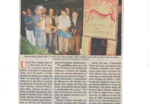 SP Repórter, 15 de janeiro de 2007, reportagem “Memorial Sakai: Embu ensina arte milenar da terracota”. Inauguração do painel de terracota. Mais Folia de Reis...