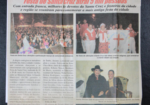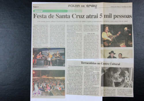 Folha de Embu, 31 de maio de 2007, reportagens “Festa de Santa Cruz atrai 5 mil pessoas.” E “Terracotistas no Centro Cultural” sobre a exposição...