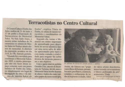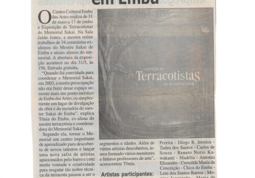 Folha de Embu, maio de 2007, reportagem  de terracotistas no Centro Cultural de Embu das Artes. Exposição do grupo do Memorial Sakai.