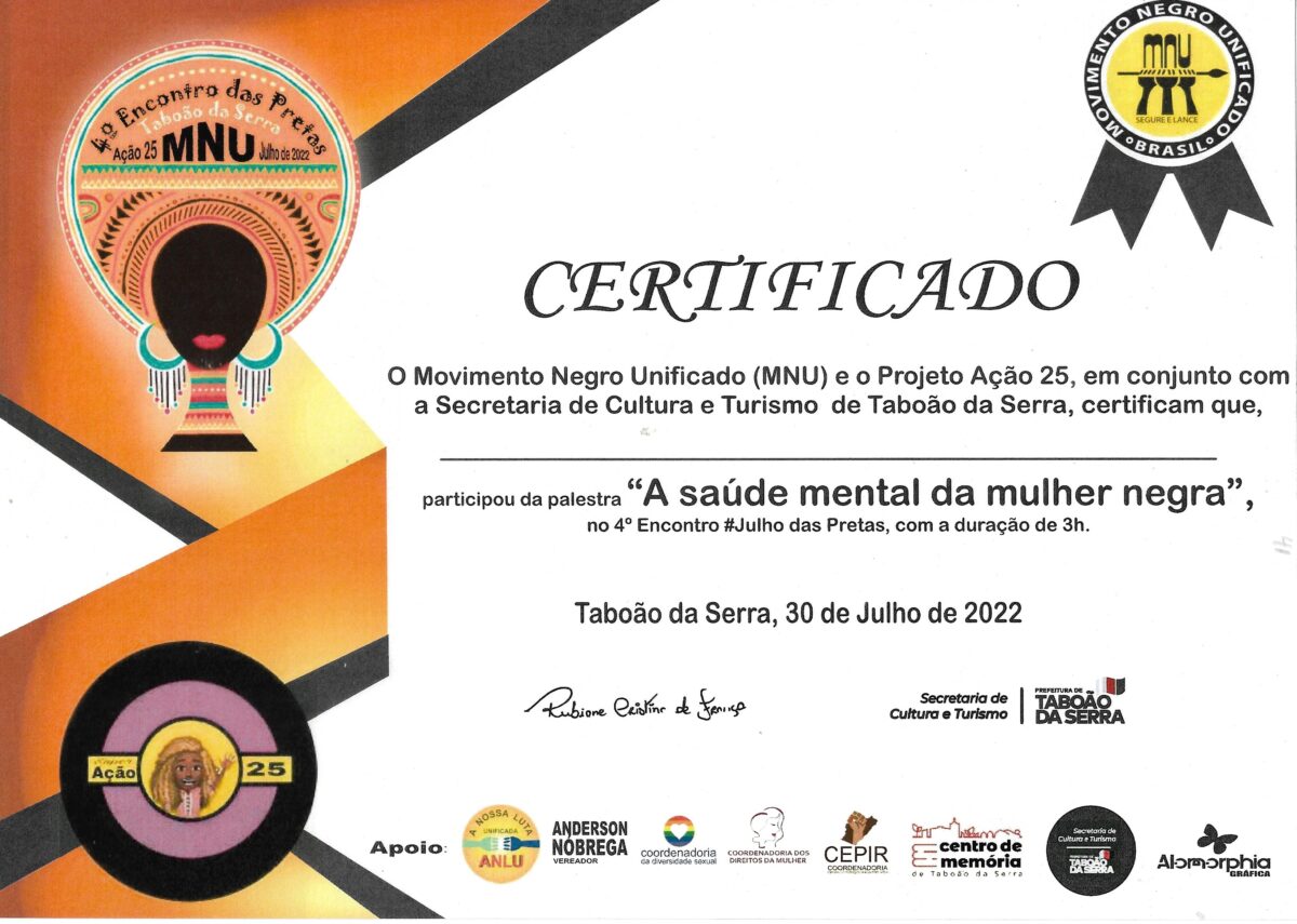 Certificado da palestra “A saúde mental da mulher negra”, julho de 2022. 4º Encontro das Pretas. Movimento Negro Unificado (MNU) e Projeto Ação 25.