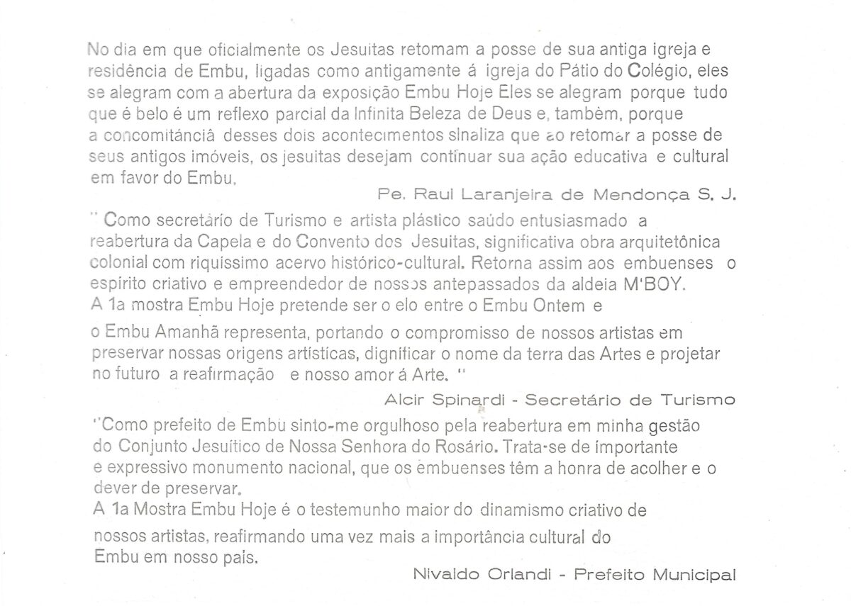 Catálogo da 1ª Mostra de Arte Embu Hoje – Realização Museu de Arte Sacra e governo municipal com vários artistas de Embu e carta da...
