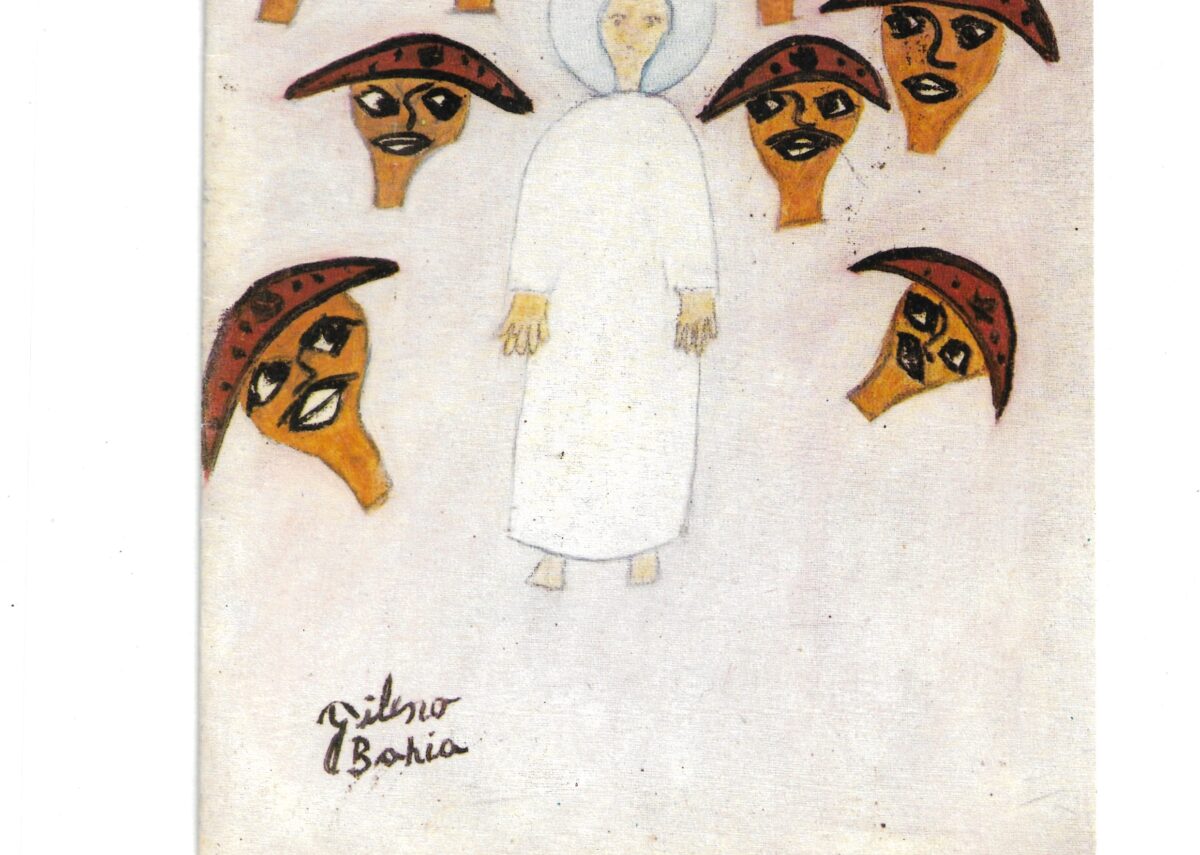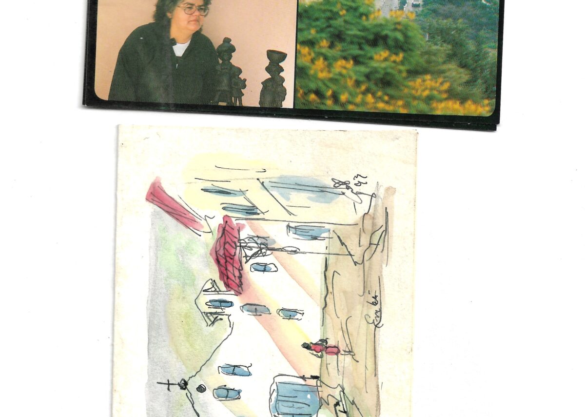 Cartão postal com foto de Tonia do Embu, Gondin e Museu de Arte Sacra. Cartão festivo, 1993, com ilustração de Gondin.