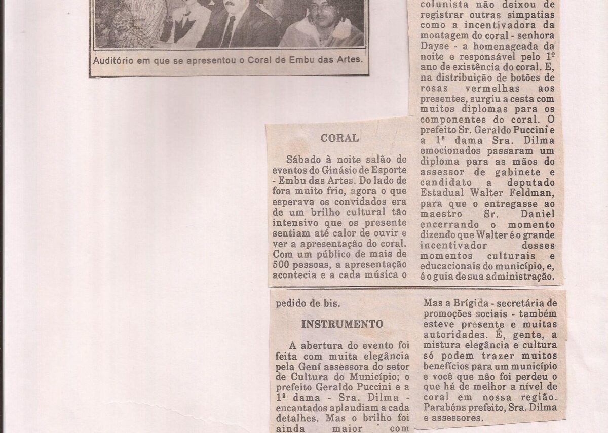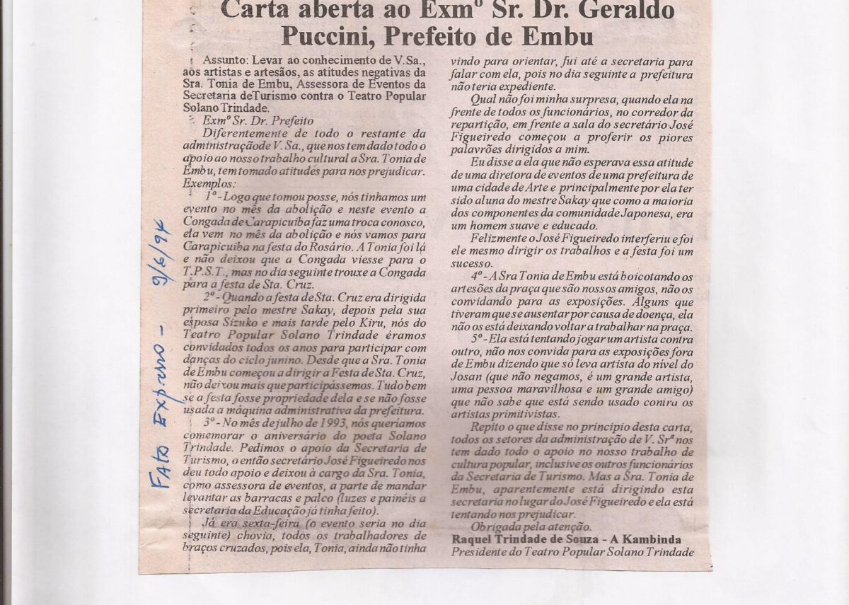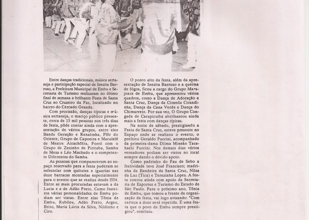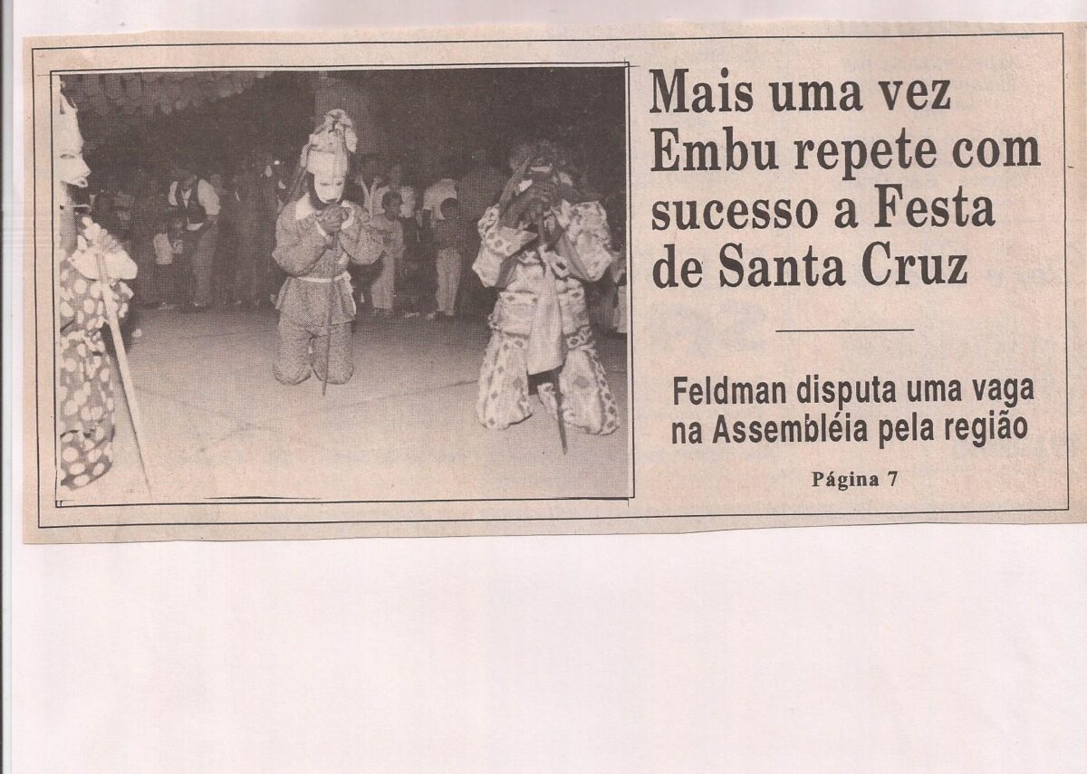 Esta pasta contém chamadas de eventos populares e religiosos em Embu entre os anos de 1994 e 1995, vinhetas, chamadas, panfletos e reportagens. Contém material dedicado ao artista Agenor Francisco dos Santos, com catálogo e reportagem sobre seu falecimento.