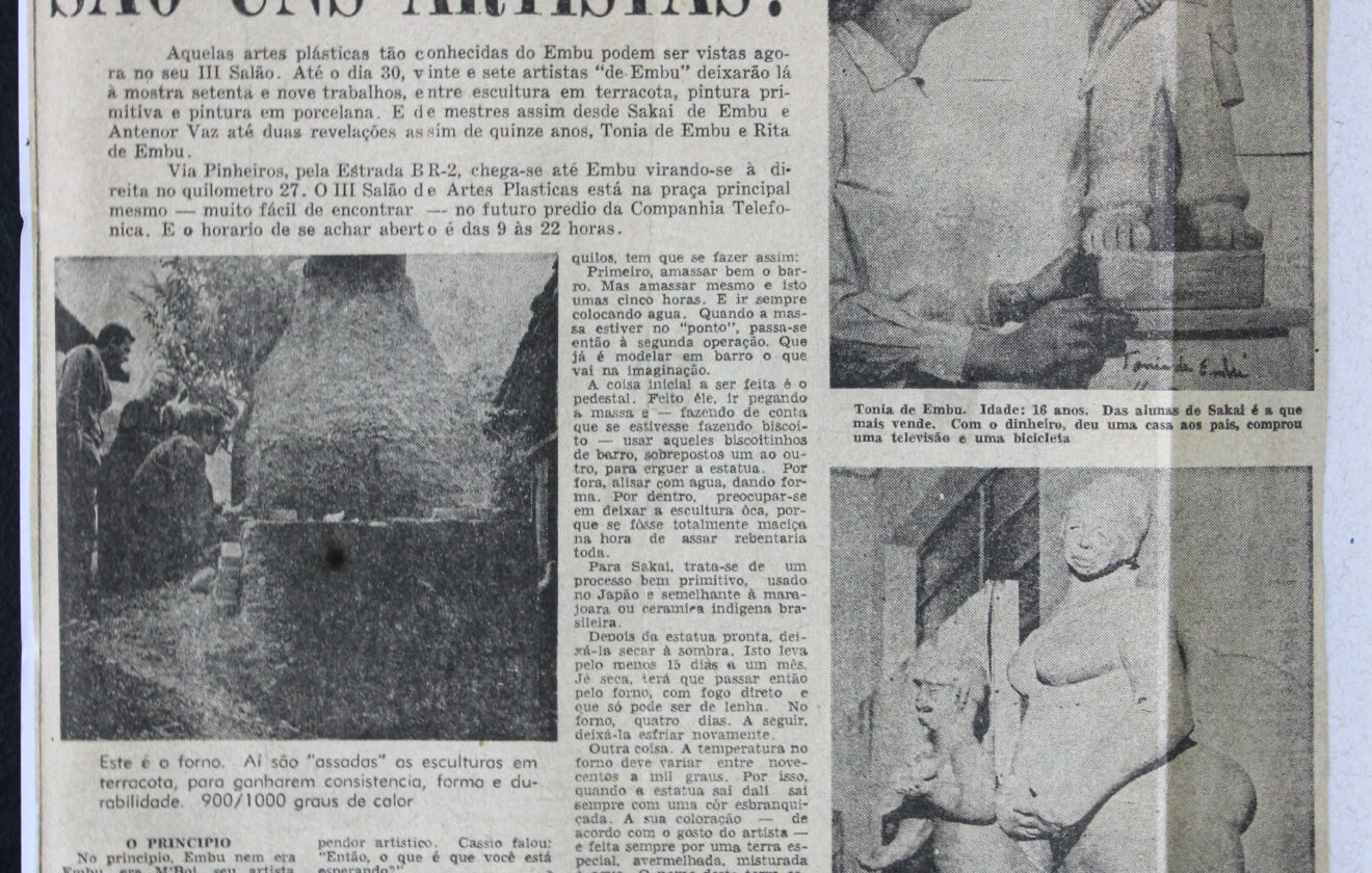 Diário de S. Paulo, 23 de outubro de 1966. Essa Gente de Embu são uns Artistas. Reportagem sobre artistas de Embu, passagens de Cassio M’Boy, Sakai, Tônia. Imagens de Tônia e peças de cerâmica.