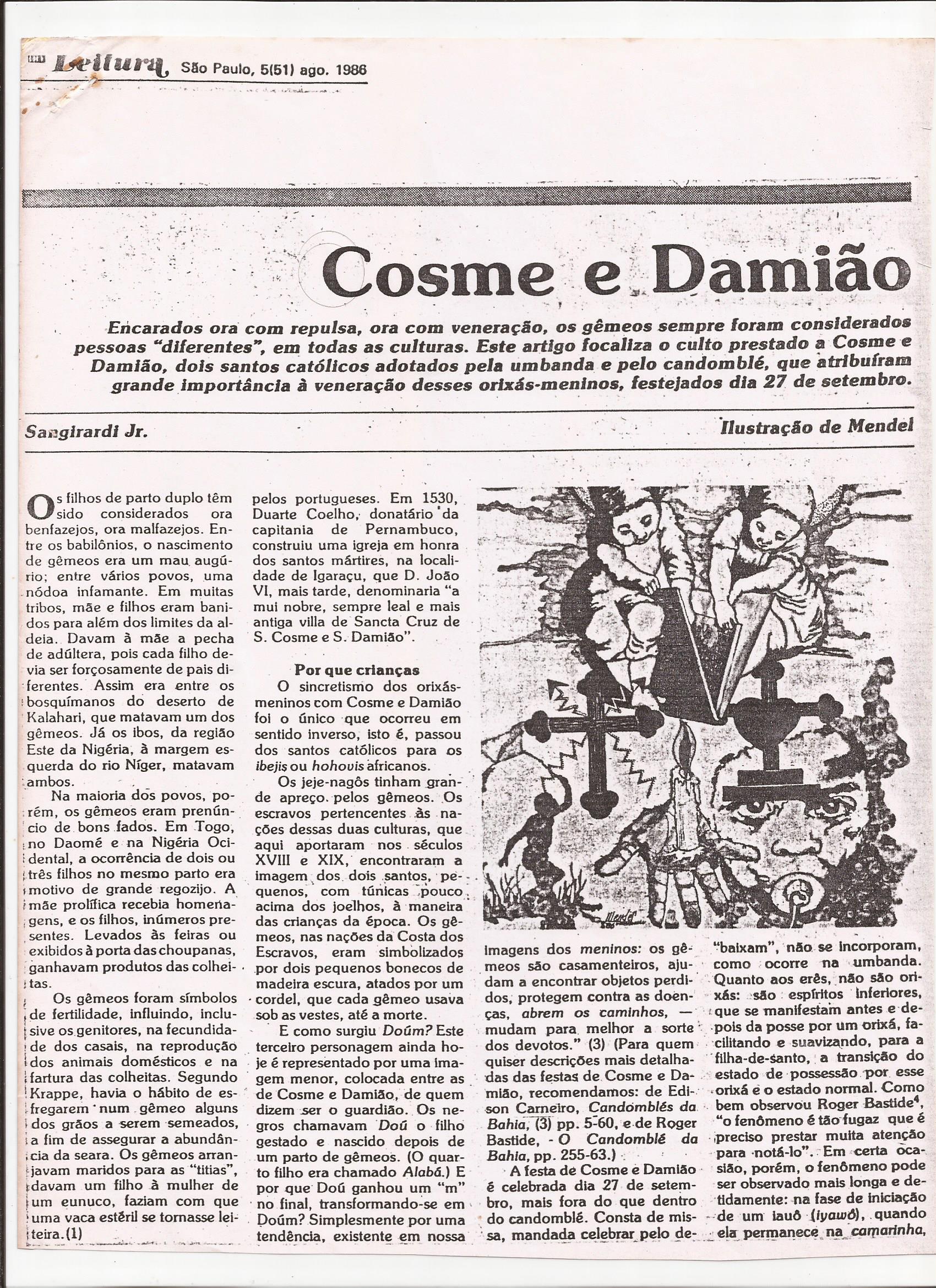 D.O. Leitura, agosto de 1986, “Cosme e Damião”, ilustração Mendel. Publicação cultural da imprensa Oficial do Estado.