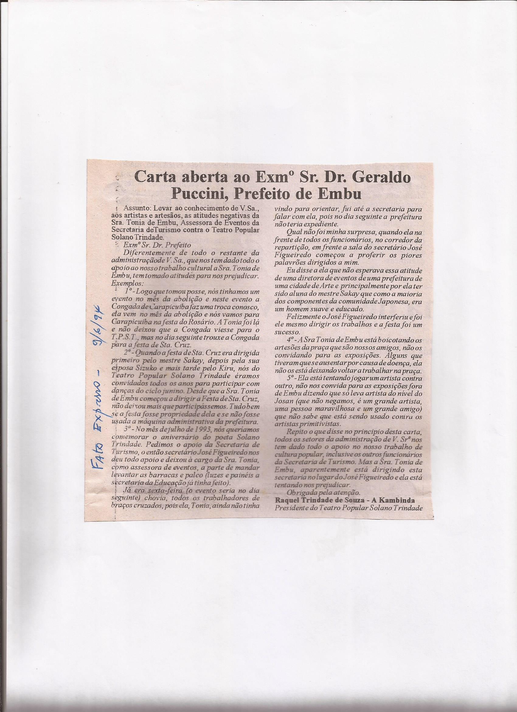 Fato Expresso, junho de 1994, Carta Aberta ao prefeito Geraldo Puccini, escrita por Raquel Trindade.