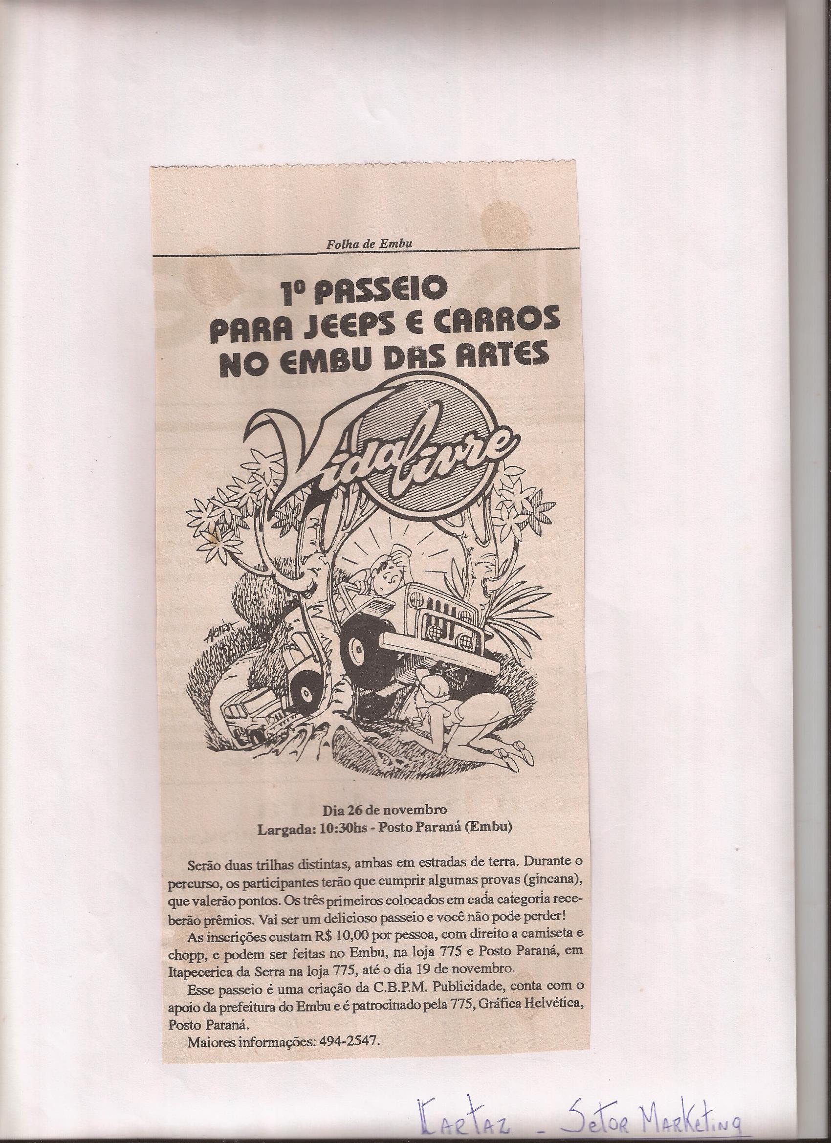 Folha de Embu, panfleto 1º Passeio para Jipes e Carros no Embu das Artes.