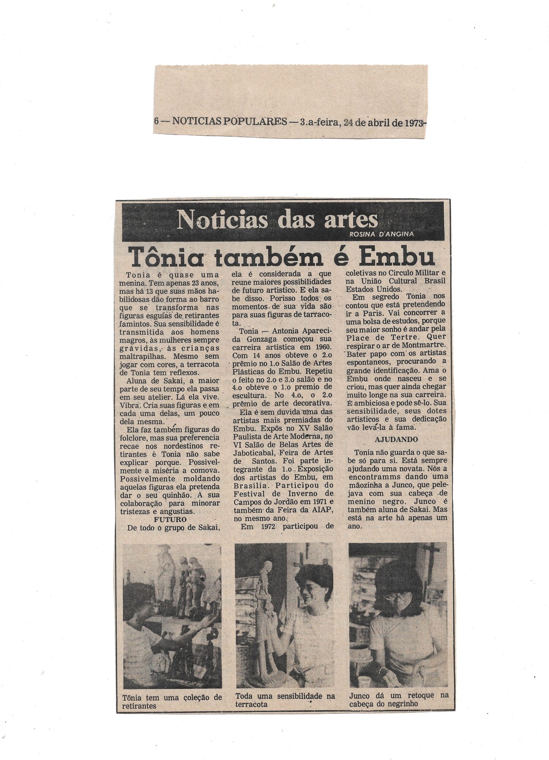 Notícias Populares, 24 de abril de 1973, Tônia também é Embu. Aos 23 anos, contém fotos de suas peças na reportagem.