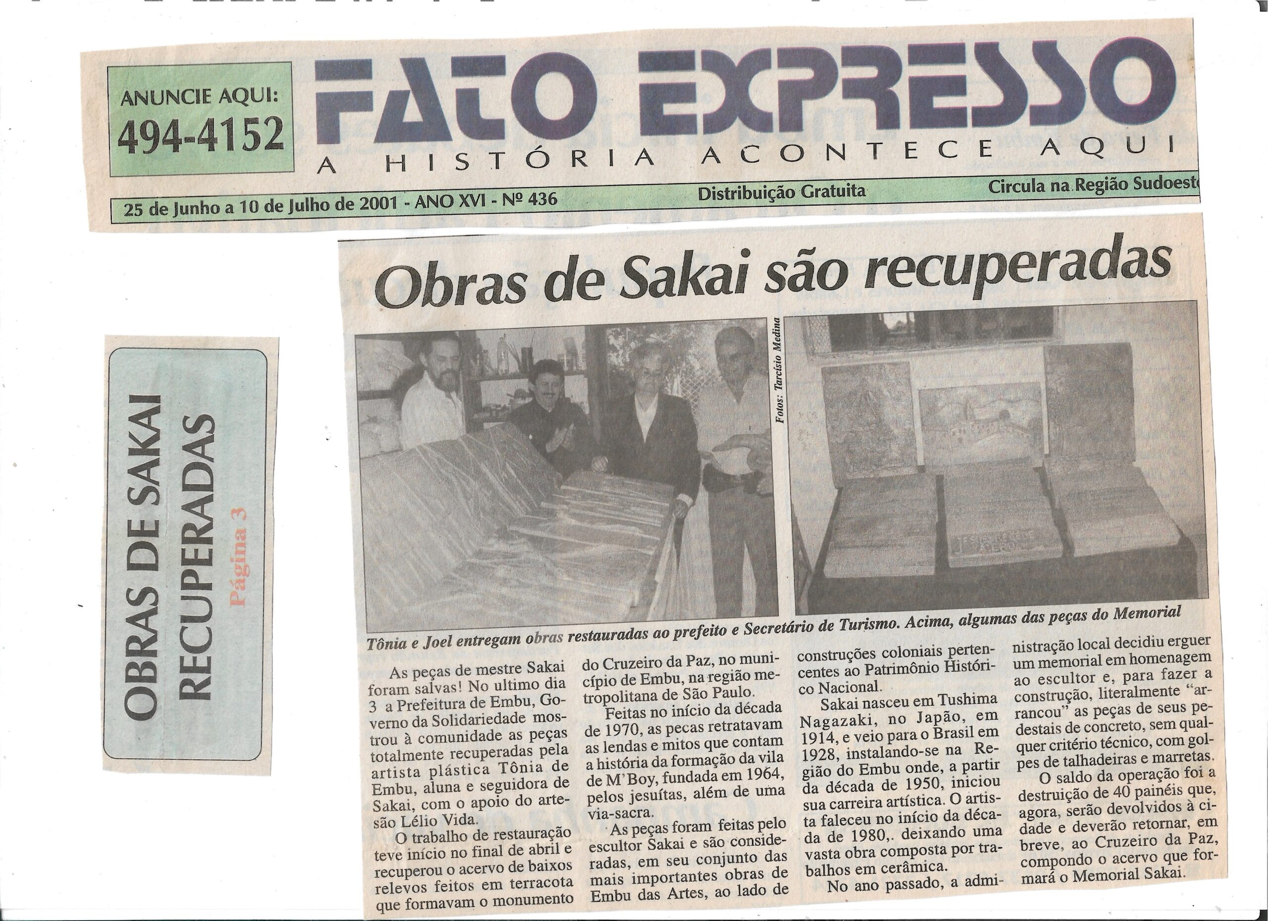 Fato Expresso, junho a julho de 2001, reportagem “Obras de Sakai são recuperadas”. Sobre a recuperação por Tônia do Embu e Joel Câmara.