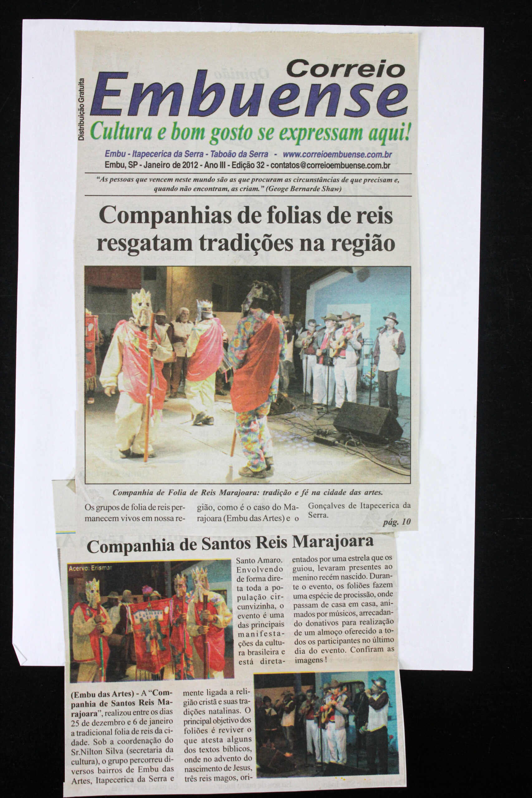 Correio Embuense, janeiro de 2012, reportagem sobre companhias de Folia de Reis da região, destaque para a Folia de Reis Marajoara em Embu.