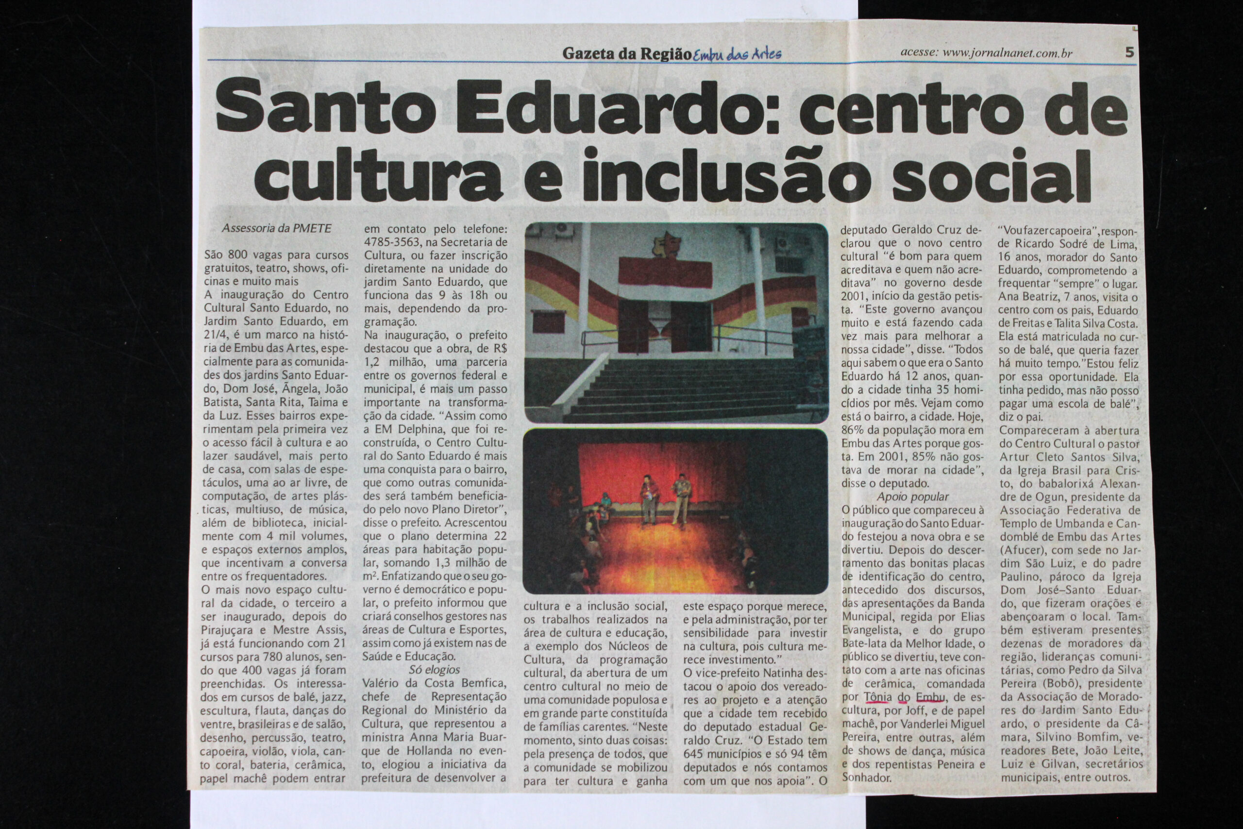 Gazeta da Região Embu das Artes, data não identificada, reportagem “Santo Eduardo: centro de cultura e inclusão social”. Inauguração do Centro Cultural.