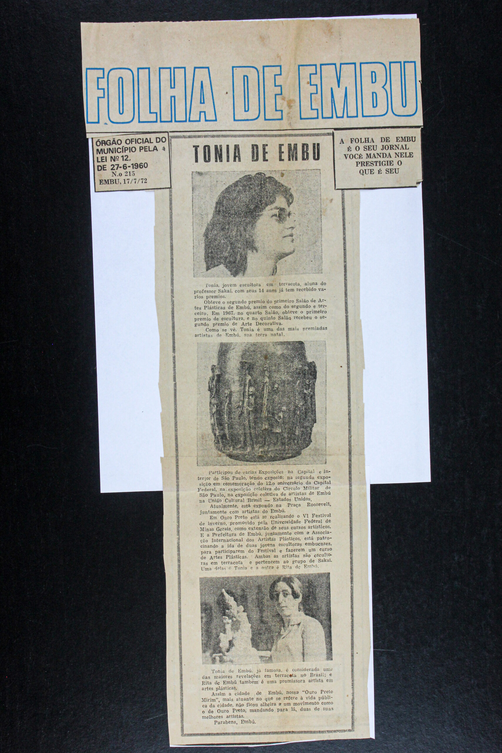 Folha de Embu, julho de 1972, reportagem sobrle Tônia de Embu, suas premiações e representação de Embu.