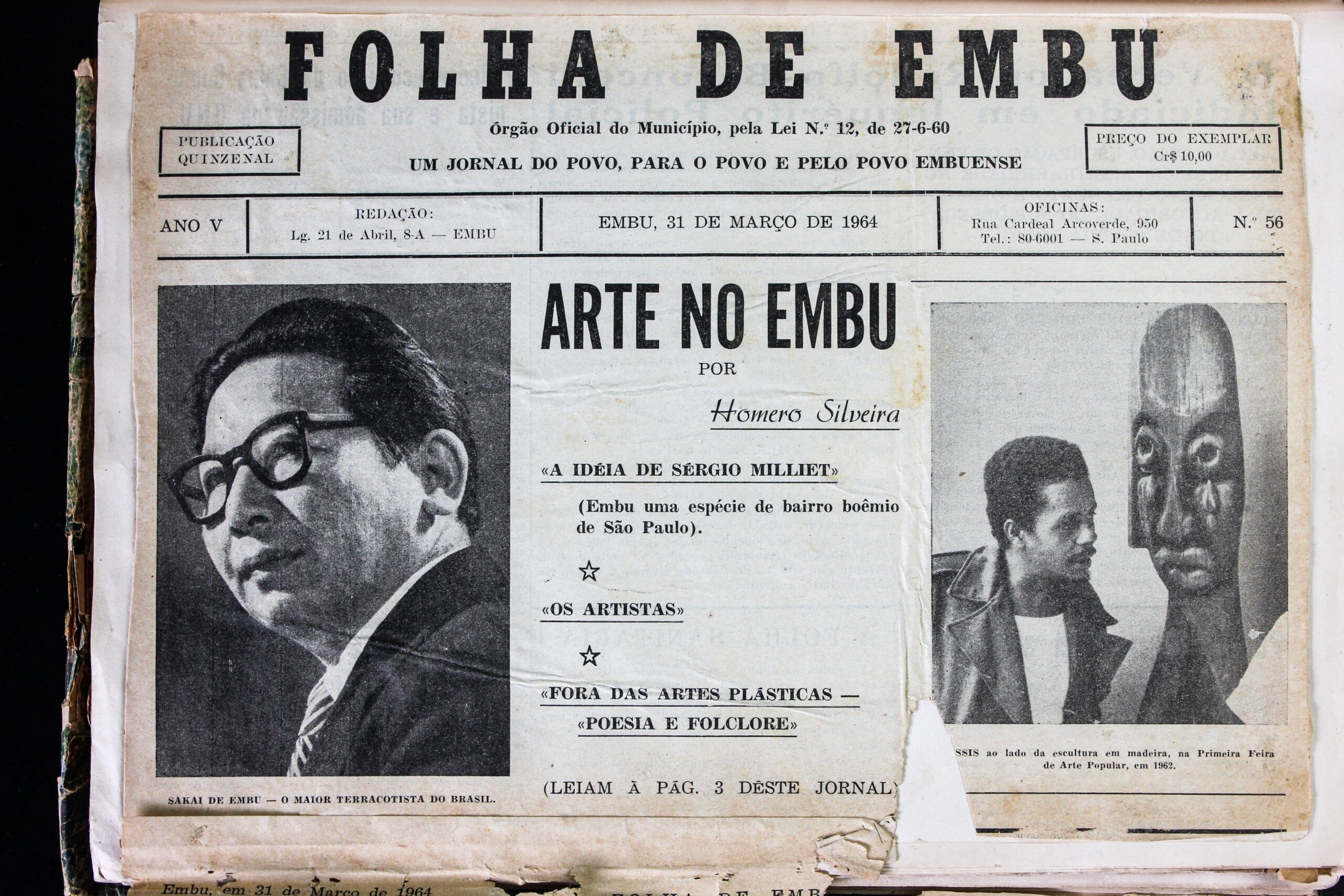 Folha de Embu, 31 de março de 1964, reportagem especial “Arte no Embu”, com Sakai, Tonia, Assis e Solano Trindade. Artes plásticas, poesia e folclore....