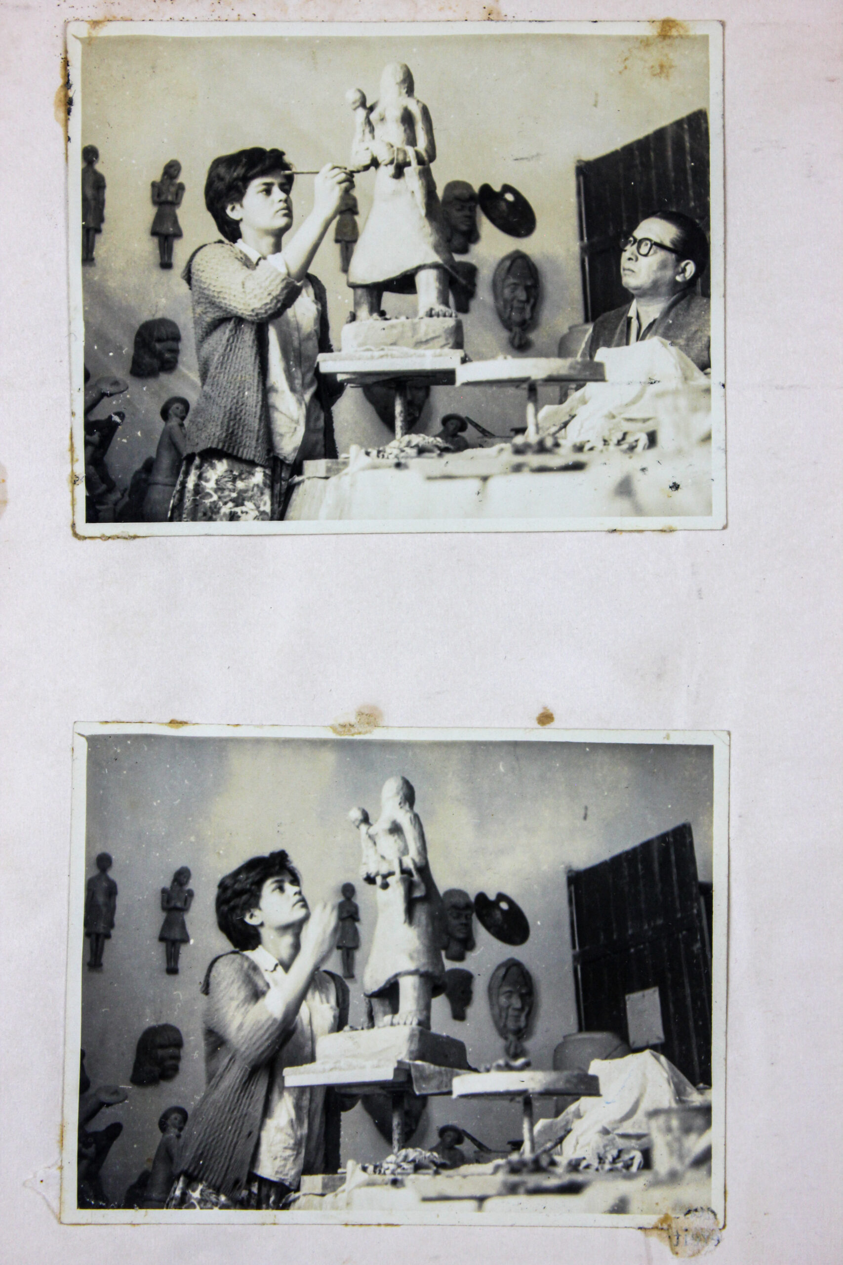 Duas fotografias. Sakai e Tonia de Embu no ateliê de cerâmica.