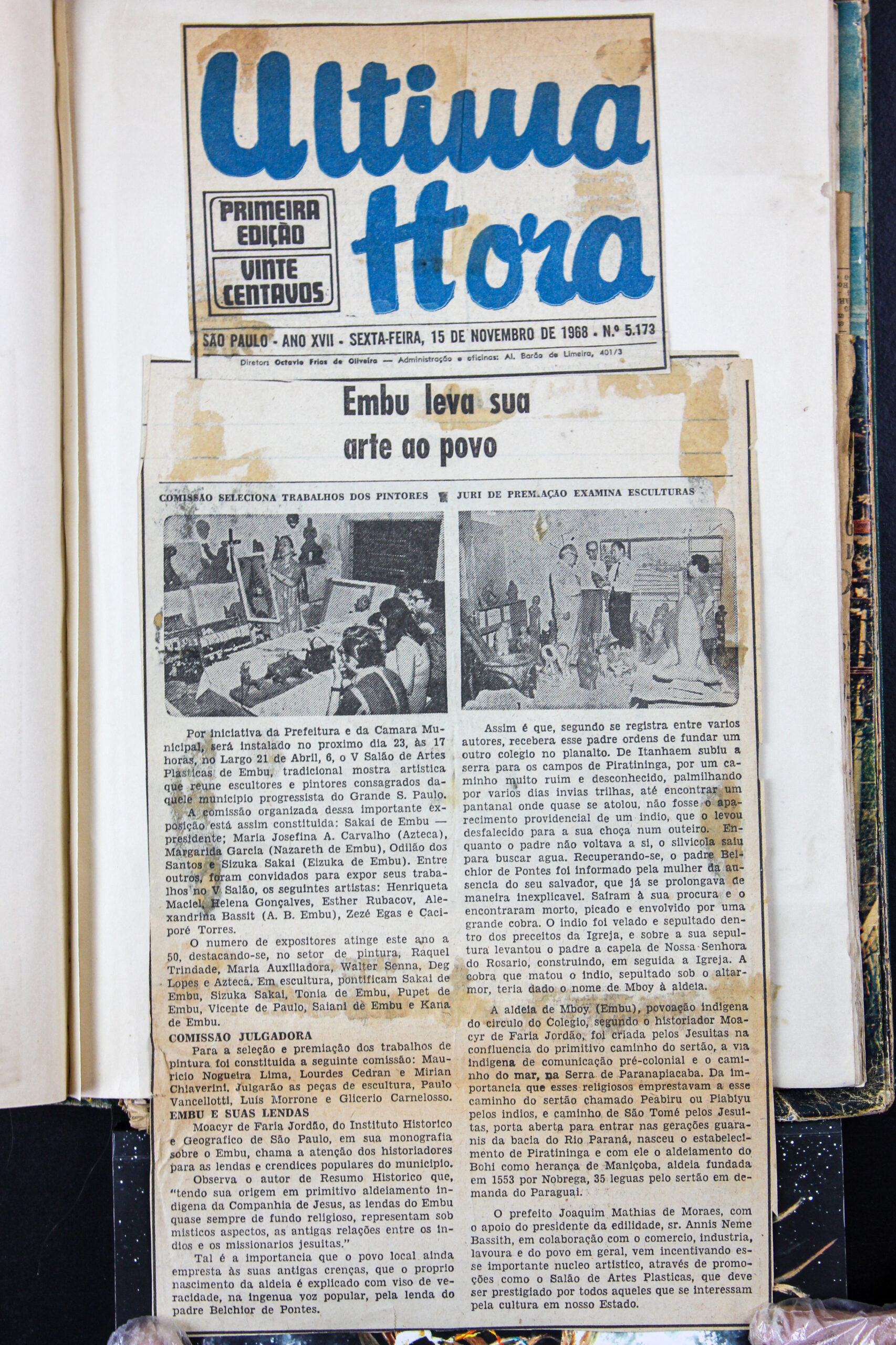 Jornal Última Hora, novembro de 1968, reportagem “Embu leva sua arte ao povo” sobre o V Salão de Artes Plásticas do Embu, adendo a Moacyr...