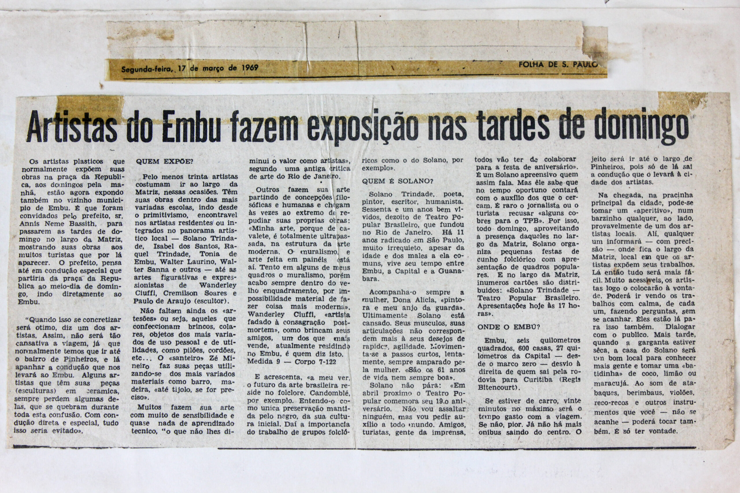 Folha de S. Paulo, março de 1969, reportagem “Artistas do Embu fazem exposição nas tardes de domingo”, sobre o início da vinda dos artistas da Praça da República a Embu.