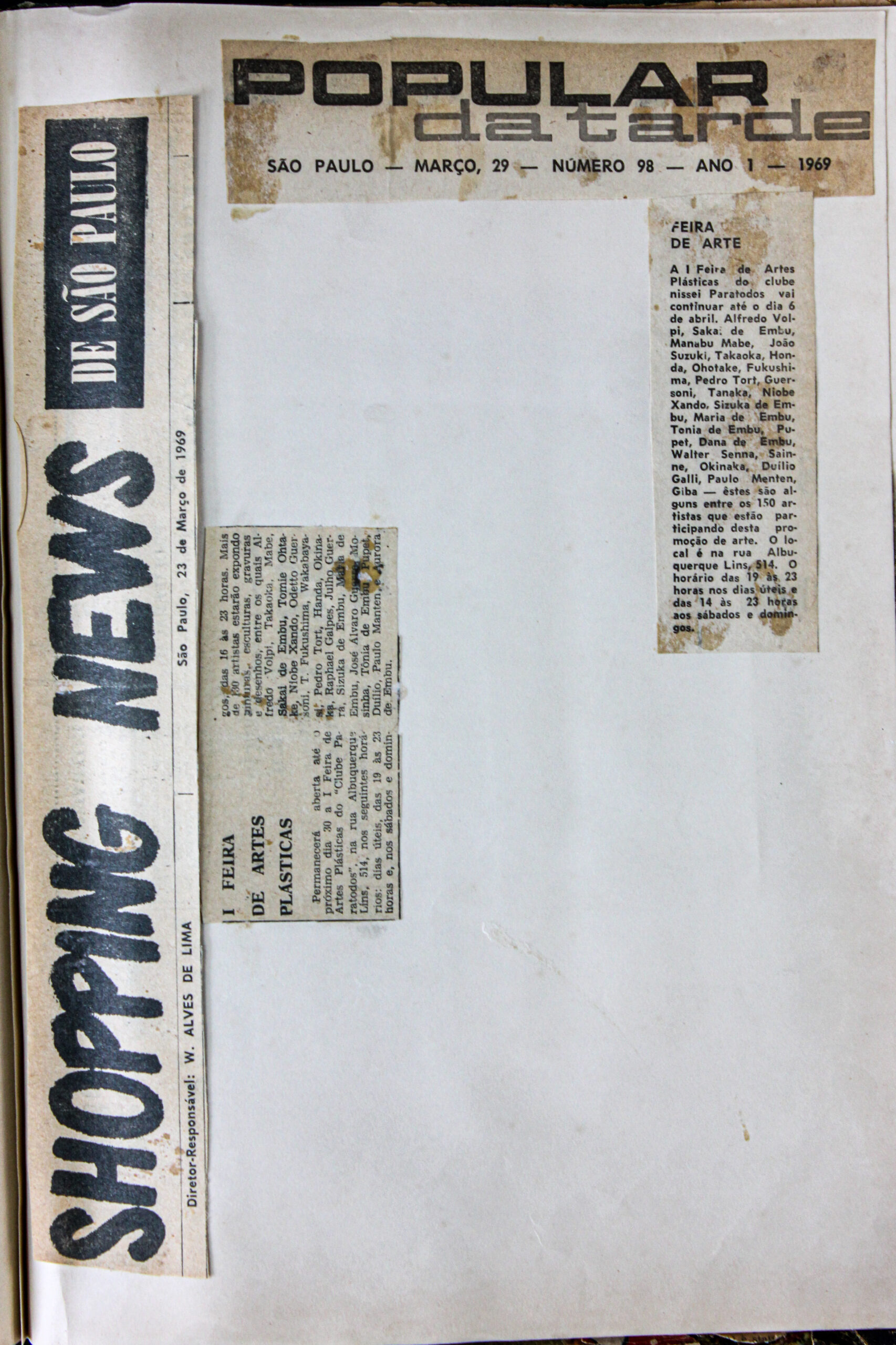 Shopping News e Popular da Tarde, março de 1969, vinhetas I Feira de Artes Plásticas do Grupo Paratodos, com presença de Sakai e artistas do Embu.