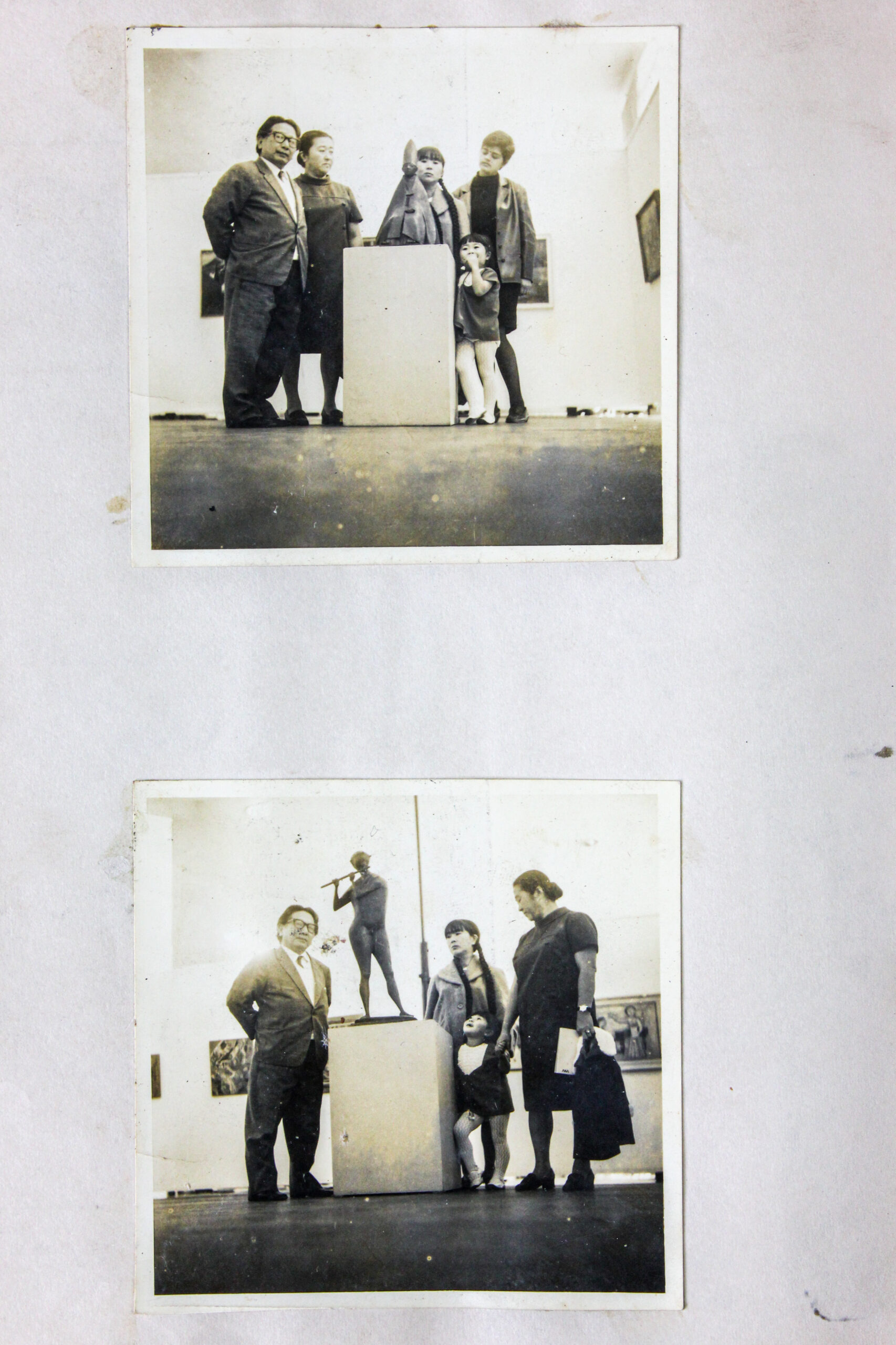 Duas fotografias. Com Tonia, Sakai e família em uma exposição.