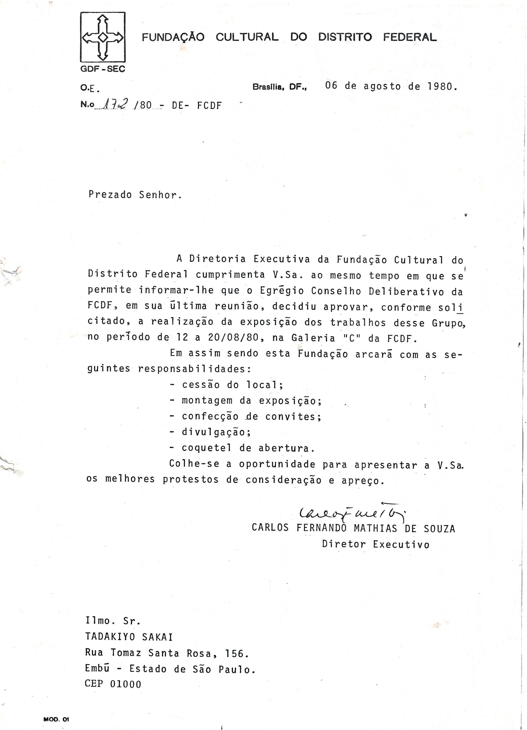 Fundação Cultural do Distrito Federal, agosto de 1980, carta destinada a Sakai sobre patrocínio para a exposição do Grupo Sakai.