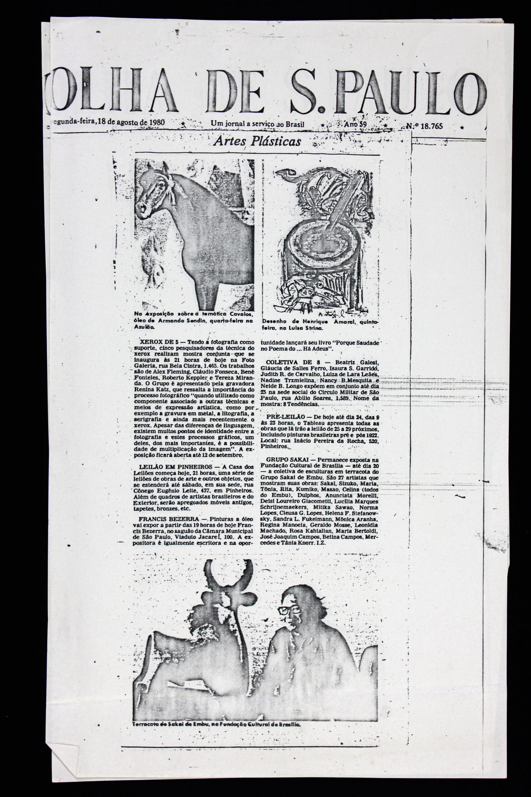 Folha de S. Paulo (xerox), agosto de 1980, Caderno de Artes Plásticas, com destaque ao Grupo Sakai e exposição na Fundação Cultural Brasília.