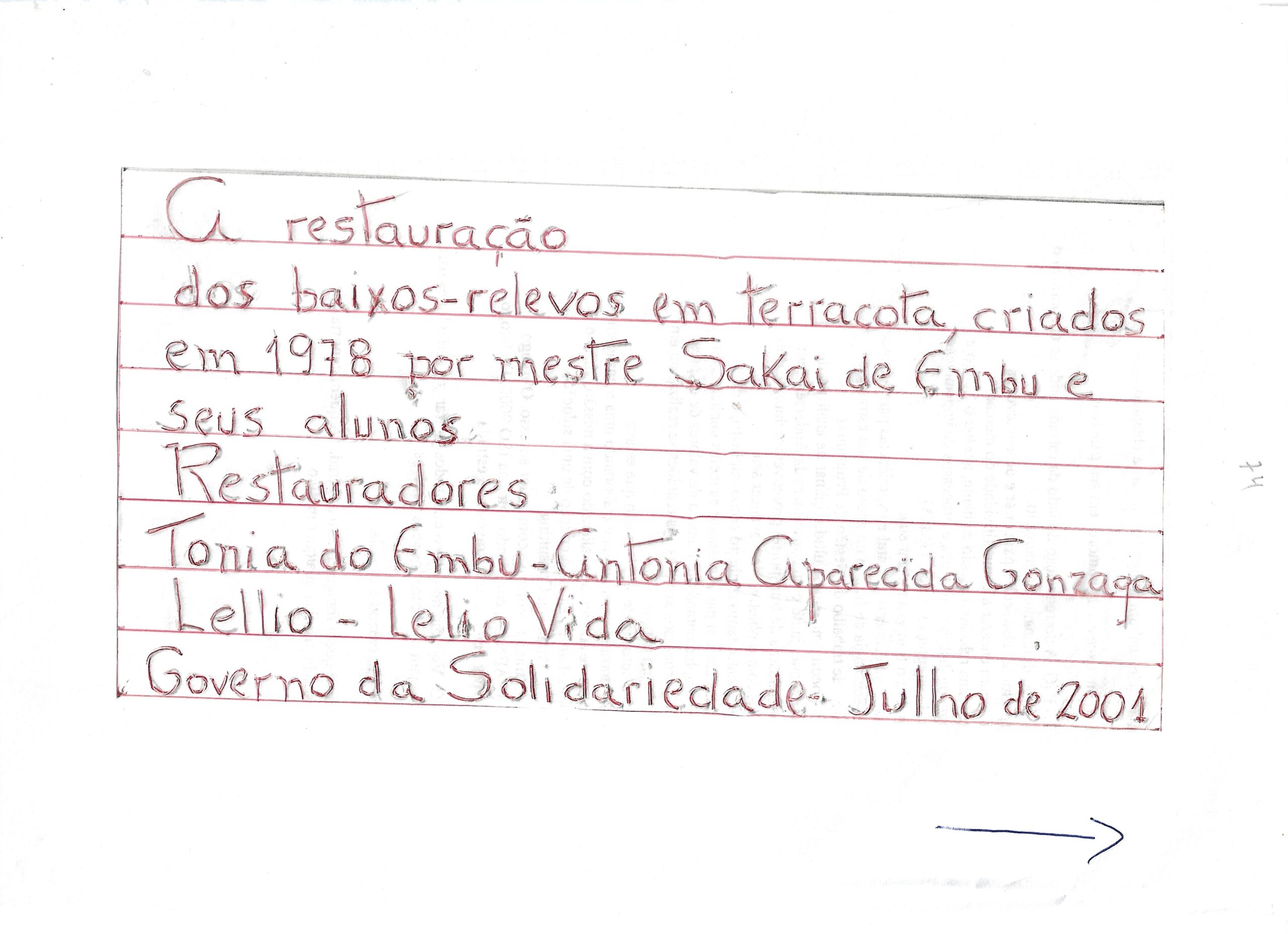 Escrito à mão (frente) por Tônia do Embu sobre restauração dos baixos-relevos de Sakai, julho de 2001.