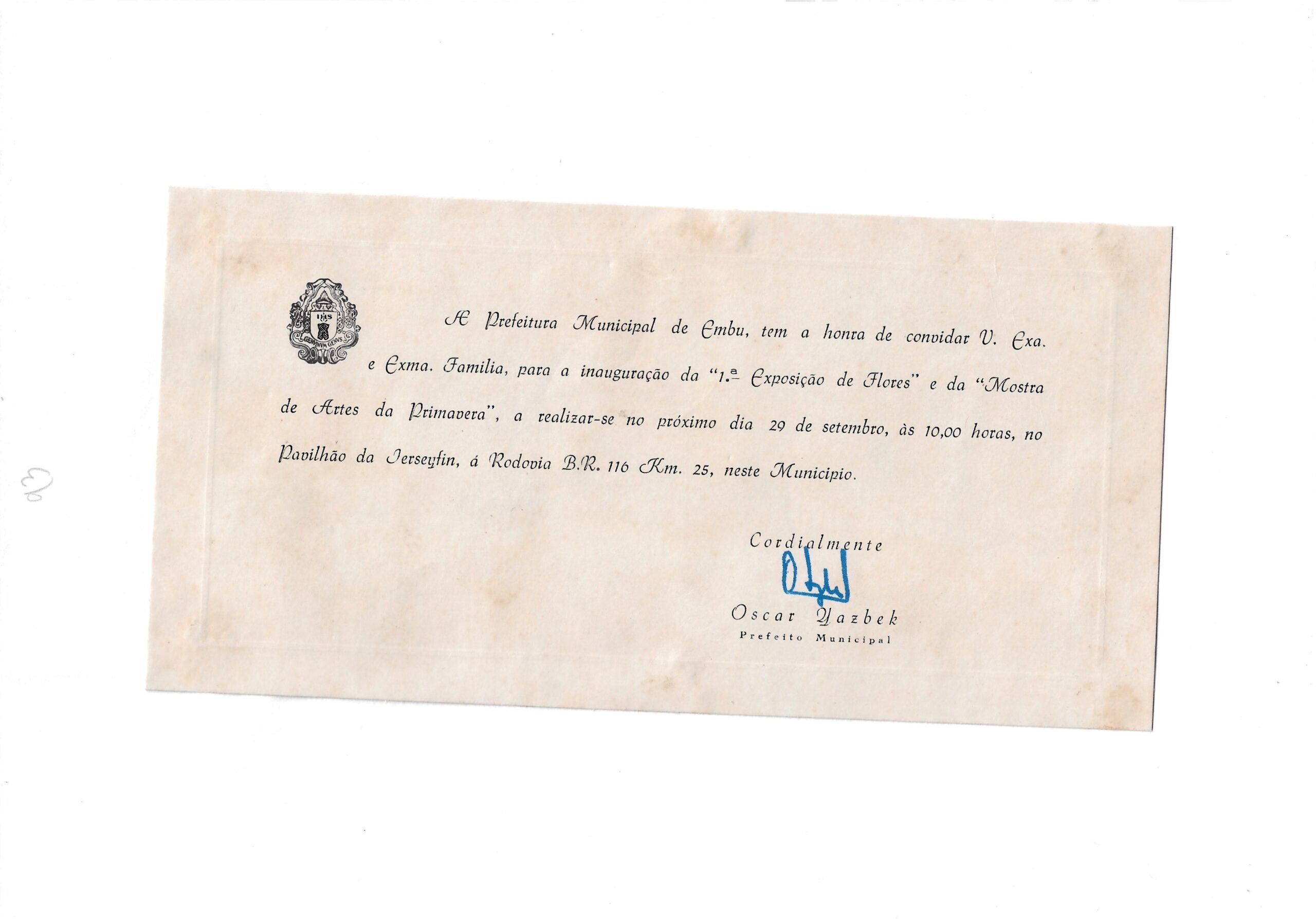 Convite a Sakai para a Exposição de Flores e da Mostra de Artes da Primavera – então prefeito Oscar Yazbek.